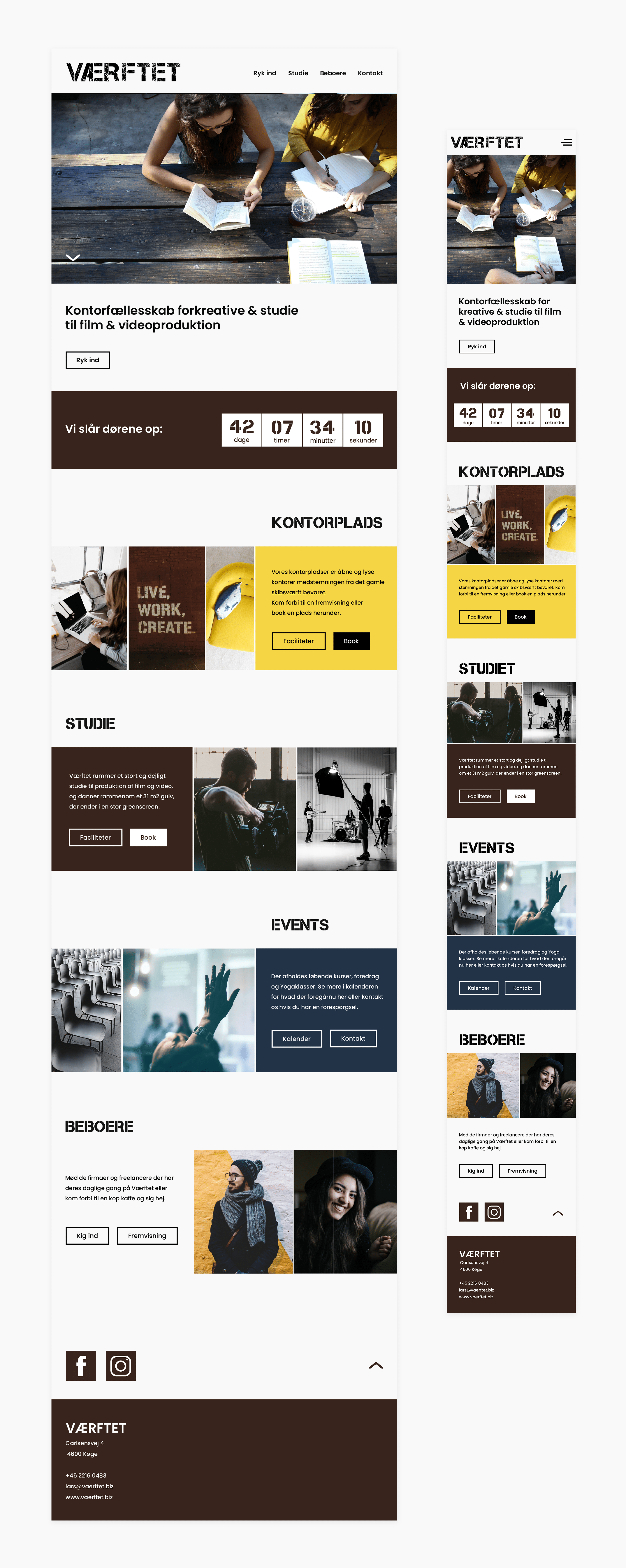 Værfet needed a visual identity and a website for desktop and mobile with a booking system. The challenge was to make a visual identity from scratch and to reach the target group without in-depth user research and usability testing. Scroll down this page to see the outcome of the project and how we approached the challenge.